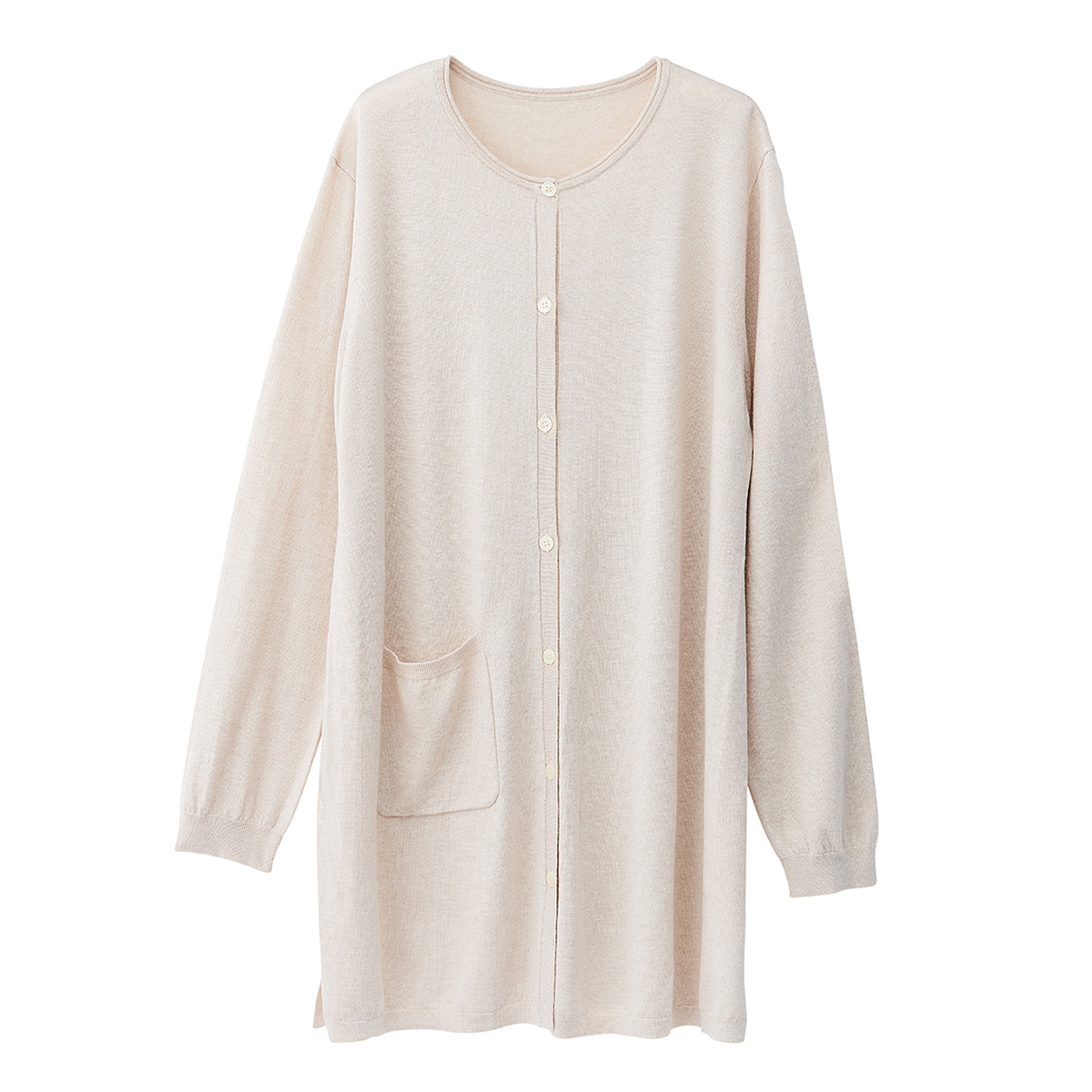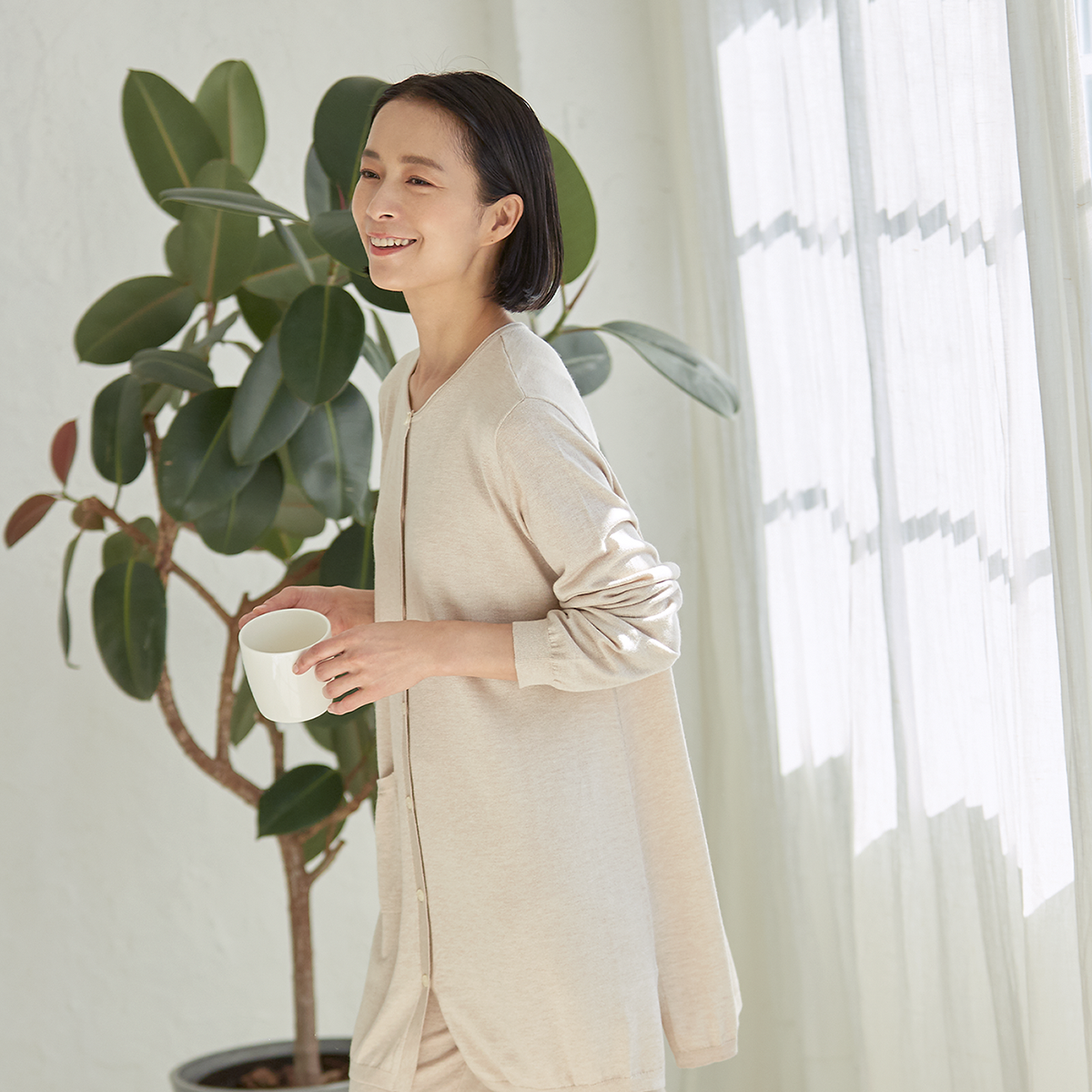 カーディガンは羽織るだけで手軽に防寒でき、シルクの吸湿コントロール性が汗を発散させ、通気性を確保するため、室内外で快適に着用できます。